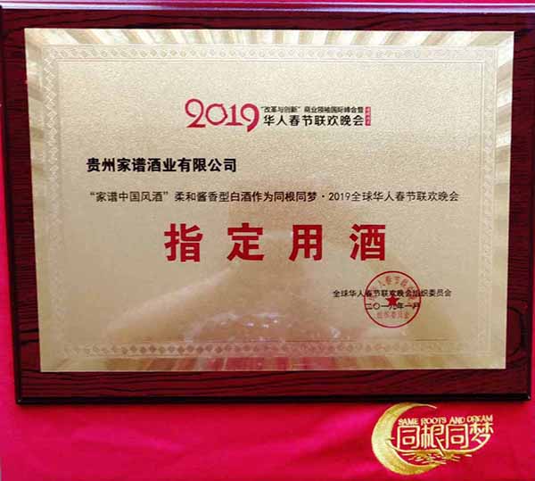 貴州家譜酒榮獲2019全球華人春節(jié)聯(lián)歡晚會(huì)指定用酒